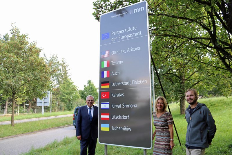 Ein altes Schild mit den Partnerstädten war bereits in die Jahre gekommen und verblasst. Das neue Schild zeigt in chronologischer Folge der Gründung der Städtepartnerschaften die einzelnen Städtenamen neben der jeweiligen Landesflagge: Glendale/USA (Städtepartnerschaft 1976 gegründet), Teramo/Italien (1981 mit der Provinz Teramo, 1986 mit der Stadt Teramo), Auch/Frankreich (1990), Lutherstadt Eisleben/Sachsen-Anhalt in Deutschland (1990), Karataş/Türkei (2009), Kiryat Shmona/Israel (2009), Litzelsdorf/Österreich (2009) und Tschernihiw/Ukraine (2009). „Man sieht am Ortseingang, dass unser Herz europäisch schlägt“, freute sich Alexandra Hartge über das neue Schild. In den kommenden Wochen sollen weitere Schilder an der Europastraße, Donaustraße, Münchner Straße, Benninger Straße, Allgäuer Straße und Bodenseestraße verankert werden.