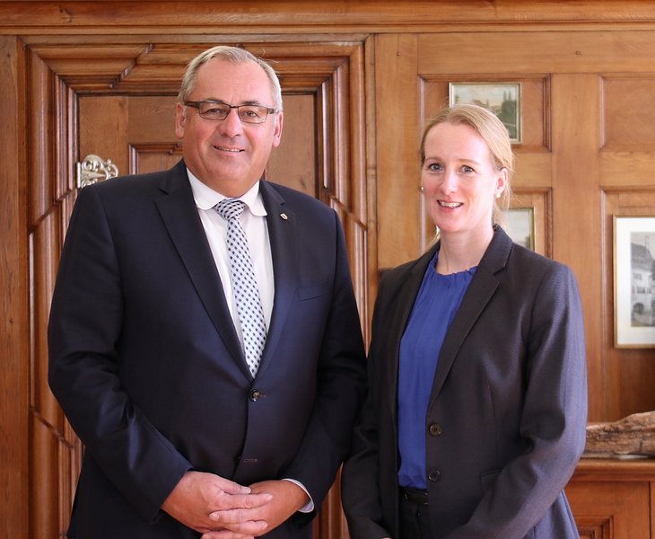 Studiendirektorin Sandra Konzelmann ist seit diesem Schuljahr Leiterin der Johann-Bierwirth-Schule in Memmingen. Oberbürgermeister Manfred Schilder begrüßte die Nachfolgerin von Meinrad Stöhr deshalb in seinem Amtszimmer.