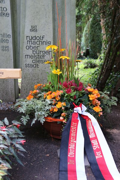 Der SPD Politiker und ehemalige Oberbürgermeister Rudolf Machnig starb am 14. August 1968. Ab 1952 war er Mitglied des Stadtrats, ab Mai 1956 Zweiter Bürgermeister und im März 1966 wurde er mit fast 70 Prozent der Stimmen zum Stadtoberhaupt gewählt. Außerdem war er von 1953 bis 1966 auch Mitglied des Bayerischen Landtags. Zu seinem 50. Todestag gedachten Bürgermeisterin Margareta Böckh, Bürgermeister Dr. Hans-Martin Steiger und Alt-Oberbürgermeister Ivo Holzinger dem ehemaligen Stadtoberhaupt an seinem Grab auf dem Waldfriedhof.