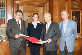 Oberbürgermeister Dr. Ivo Holzinger hat die Schirmherrschaft über das Projekt "Stolpersteine" des Künstlers Gunter Demnig in Memmingen übernommen. Zur Unterzeichnung der Schirmherrschaftsurkunde konnte Holzinger neben Helmut Wolfseher, Vorsitzender des Vereins "Stolpersteine in Memmingen", auch dessen Stellvertreter Herbert Diefenthaler und die Kassiererin Andrea Wanner im Rathaus begrüßen.