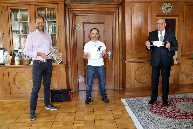 In den Sets, die der Oberbürgermeister verschenkte, sind Stoffe, Klammern und Gummibänder für zwei Masken enthalten die wiederverwendet werden können. Die Lösung mit Stoffen und Klammern kann ohne Nähen hergestellt werden, ist nachhaltig und trägt zur Müllvermeidung bei. Die Klammern zur Befestigung des Stoffes konnten mit Hilfe der Gruppierung „Maker vs Virus“ auf privaten 3D-Druckern angefertigt werden. Um sich persönlich für die ehrenamtliche Unterstützung der „Macher“ aus Memmingen und dem Allgäu zu bedanken, empfing Oberbürgermeister Manfred Schilder Sascha Klenner und Stefan Keppeler, zwei der Organisatoren, in seinem Amtszimmer. „Vielen Dank für diese geniale Idee und die tatkräftige Unterstützung dieser Aktion“, sprach Schilder seine Anerkennung aus. Der Dank gehe natürlich auch an alle Beteiligten, die für die Produktion der Klammern ihre Zeit, ihre Drucker und ihren Strom kostenlos zur Verfügung gestellt haben. Einzig die Materialkosten werden von der Stadt Memmingen mitgetragen. „Durch die Verwendung der Klammern kann Müll vermieden werden und zusätzlich sind sie in der Produktion fast billiger als Einwegmasken“, hob Sascha Klenner hervor. Der gebürtige Memminger war von der Zahl der Menschen die sich gestern die Zeit genommen hatten um sich ein Masken-Set zu holen sehr angetan. Weitere Masken werden an die Hilfsorganisationen, Pflegedienste und soziale Einrichtungen in Memmingen verteilt.