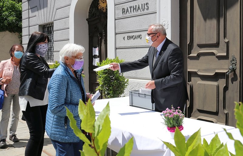 „Bleiben Sie weiterhin achtsam und tragen Sie eine Mund-Nasen-Bedeckung“, wünscht sich Oberbürgermeister Manfred Schilder von den Bürgerinnen und Bürgern. Zur Verteilung von kostenlosen Sets für solche Alltagsmasken sind geschätzt 300 Menschen vor das Rathaus gekommen. Unter dem Motto „Memmingen hält zusammen – gemeinsam durch die Krise“ bedankte sich Manfred Schilder bei den Anwesenden und mahnte, sich weiterhin an die Auflagen zu halten, damit die Maustadt coronafrei bleibe.