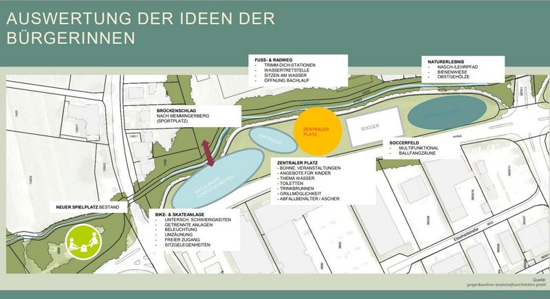 Das bisher als landwirtschaftliche Fläche genutzte, 14.500 Quadratmeter umfassende Gebiet wurde im Rahmen der Bürgerbeteiligung der Vorbereitenden Untersuchung (VU) Soziale Stadt Ost als Naherholungsbereich mit großem Potenzial benannt. Dieses Potenzial soll künftig genutzt werden und zwar als Bike- und Skatepark. Mit der Erstellung der Vorplanung des Gesamtkonzepts wurde das Büro geiger & waltner Landschaftsarchitekten aus Kempten beauftragt. Das Ergebnis der Vorplanungen stellte Thomas Geiger dem Ausschuss und den anwesenden Bürgerinnen und Bürgern vor. Er erklärte die unterschiedlichen Zonierungen und Themen Bike- und Skatepark (Street-Skatepark, Pumptrack, Bowl, Minirampe, etc.), Naturerlebnis, Aufenthaltsqualitäten, Begegnung, Bewegung, Erholung sowie Spielbereiche, in die das Areal gegliedert werden soll. Mit der Neugestaltung kann aus einer landwirtschaftlichen Fläche ein Ort der Begegnung, des Erholens, der sportlichen Betätigungen, der vielfältigen Freizeitnutzungen, des Erlebens und des Miteinanders entstehen. Dabei soll auch die auf der Westseite entlang des Haienbachs verlaufende wichtige Fuß- und Radwegeverbindung erhalten bleiben.