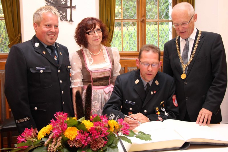 Im Anschluss trugen sich die Ehrengäste und die Vertreter aller Steinheims in das Goldene Buch der Stadt Memmingen ein. Bürgermeisterin Margareta Böckh hatte bereits zum Festabend die Glückwünsche der Stadt überbracht und das Engagement der Freiwilligen Feuerwehr Steinheim gewürdigt.