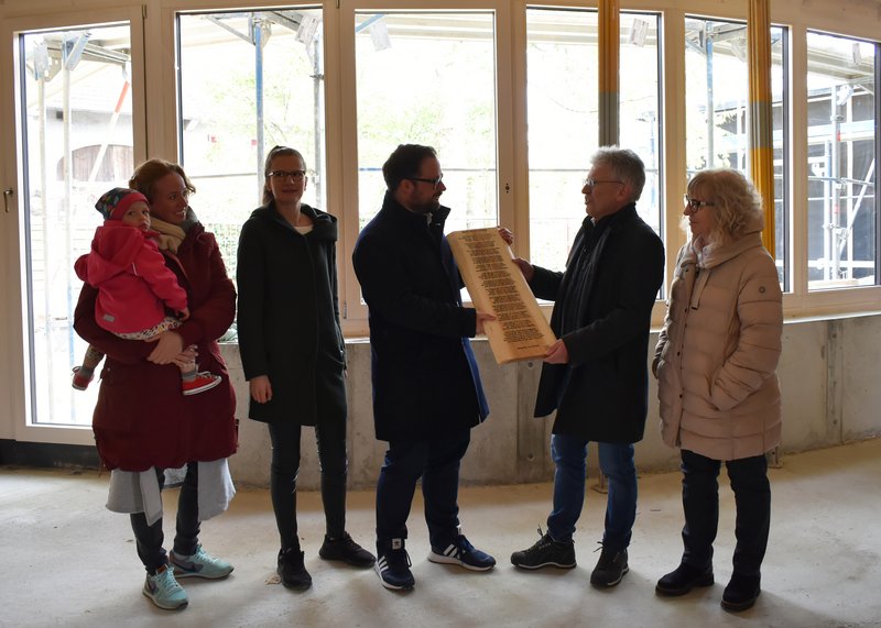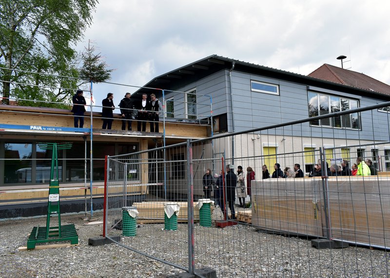 Beim Richtfest, an dem Vertreterinnen und Vertreter der Stadtverwaltung, des Stadtrats, der beteiligten Firmen, des Steinheimer Bürgerausschusses und der KiTa Steinheim teilnahmen, trugen die Zimmermänner der Firma Zettler ihren Richtspruch auf dem Gerüst des pavillionartigen, eingeschossigen Gebäude vor. Anschließend gab es für die Gäste die Möglichkeit, die entstehenden Räumlichkeiten im Rohbau in Augenschein zu nehmen.