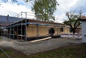 Der Neubau mit circa 304 Quadratmetern Nutzfläche, der im Südwesten des Bestandsgebäudes angefügt wurde, wurde an die Gegebenheiten des Grundstückes angepasst und nimmt dabei auch Rücksicht auf den Baumbestand. So wurde beispielsweise die Kindergarderobe mit Spielflur geschwungen entworfen, sodass die Bäume stehen bleiben konnten und ein kleiner Spielhof entstand. Die beiden Gruppenräume und der Ruheraum für bis zu 24 Krippen- und Kleinkinder orientieren sich nach Südwesten zum Gartenbereich. Direkt im Anschluss an die Gruppenräume verläuft der Gartenbereich der Kinderkrippe mit Umgang zum Spielhof. Das in hochgedämmter Massivholzweise gebaute Gebäude, dessen Spatenstich Anfang November 2023 erfolgte, soll Ende 2024 fertig werden.