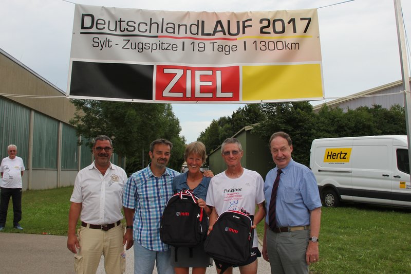 Bürgermeister Dr. Steiger zeigte sich von der Leistung der Läufer begeistert und gratulierte den Tagessiegern der 16. Etappe von Dornstadt nach Memmingen. Wilma Dierx (51 Jahre) aus den Niederlanden schaffte die 66,4 Kilometer als Schnellste der Frauen in 7 Stunden und 40 Minuten, der Deutsche Henry Wehder (55 Jahre) erreichte das Ziel bei der Johann-Bierwirth-Schule als schnellster Läufer nach 6 Stunden und 51 Minuten. Der Bürgermeister überreichte den Tagessiegern einen Rucksack mit dem Memminger Stadtwappen und wünschte für die letzten drei Etappen weiterhin viel Kraft und Erfolg.