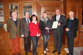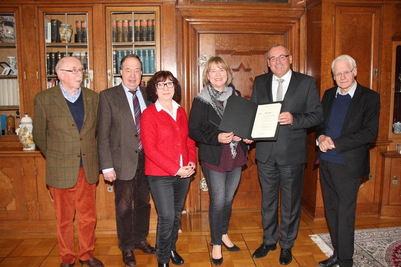 Die langjährige Stadtführerin Sabine Streck erhielt bei einer Feierstunde im Rathaus von Oberbürgermeister Manfred Schilder die Bestellungsurkunde für ihr neues Amt als zweite stellvertretende Heimatpflegerin überreicht. „Ich freue mich, dass wir das Team der Heimatpflege mit Ihnen komplettieren können“, erklärte der Oberbürgermeister. Seit dem Tod von Uli Braun im Jahr 2013 war eines der drei Ehrenämter unbesetzt geblieben. Einstimmig entschied der Stadtrat nun in seiner jüngsten Sitzung die Berufung von Sabine Streck. Bei der Feierstunde wurde sie auch von Bürgermeisterin Margareta Böckh, Bürgermeister Dr. Hans-Martin Steiger sowie Heimatpfleger Günther Bayer und stellvertretendem Heimatpfleger Dr. Wolfram Arlart beglückwünscht.