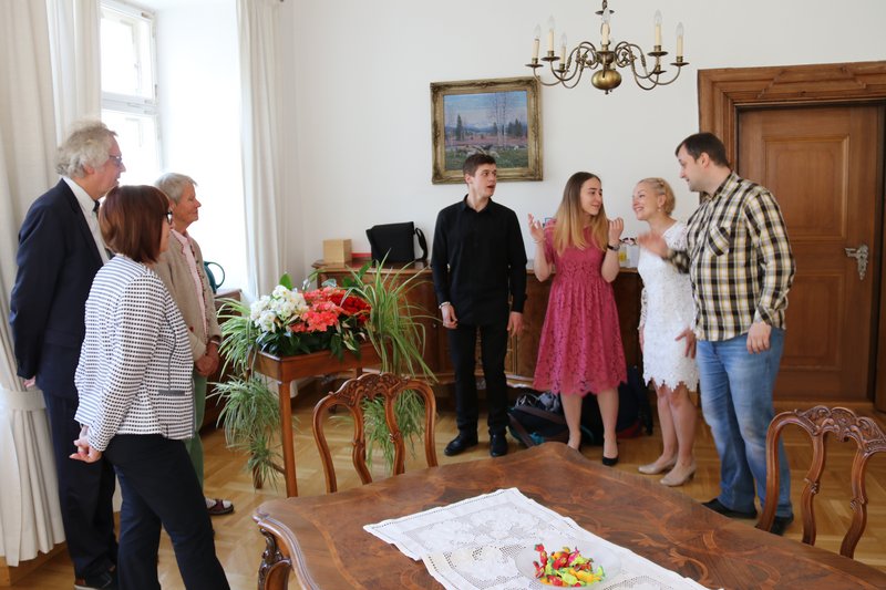 Mit temperamentvoll vorgetragenen Liedern dankten vier Sängerinnen und Sänger aus Kiew (Ukraine) für einen Empfang im Amtszimmer von Bürgermeisterin Margareta Böckh. Die Bürgermeisterin hieß die ukrainischen Musikerinnen und Musiker herzlich in der Maustadt willkommen. Otfried Richter, Leiter der städtischen Sing- und Musikschule, hatte die Formation „Ostharmonie“ zur Feier des 90-jährigen Bestehens der Musikschule zu einem Konzert im Kreuzherrnsaal eingeladen. Begleitet werden die vier Ukrainerinnen und Ukrainer in Memmingen von Elke Scheller und Otfried Richter.
