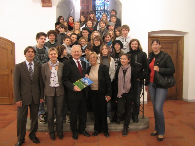 Oberbürgermeister Dr. Ivo Holzinger empfing 18 Schülerinnen und Schüler des Oratoire Sainte-Marie, der Partnerschule des Bernhard Strigel Gymnasiums, aus der Memminger Partnerstadt Auch im Rathaus. Die französischen Schüler sind fast zwei Wochen in Memmingen. Sie sind bei Gastfamilien untergebracht. Besonders hob Oberbürgermeister Dr. Holzinger die enge sowie traditionelle, städtepartnerschaftliche Beziehung zwischen Memmingen und Auch hervor. Er erinnerte bei dieser Gelegenheit an den Besuch einer Delegation der Stadt Memmingen im Mai diesen Jahres in Auch, bei dem auch die Musketiere mit von der Partie waren. Der Schüleraustausch zwischen den beiden Schulen besteht bereits seit 32 Jahren. Die Jugendlichen sind von der Maustadt begeistert, dies zeigt, daß die Hälfte der jungen Leute bereits vor einem Jahr schon einmal hier war.