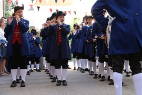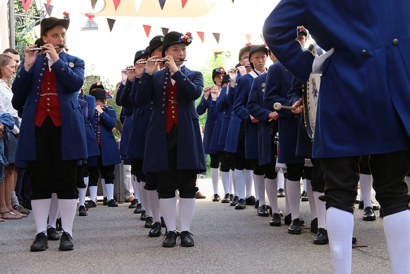 Wie in jedem Jahr eröffneten die Trommlerbuben und –mädchen die Woche der Heimatfeste mit der Darbietung mehrerer Stücke vor dem festlich geschmückten Bürgerstift. Gerlinde Arnold steckte dort zum Dank Trommler Lukas Zeiler und Tambourmajor Leon Noszkovics den Maustecker für zehn Jahre aktives Musizieren beiden Trommlern an.