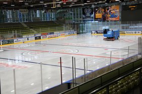 Die Spiellinien der Eisfläche in der Memminger Eissporthalle erstrahlen seit heute Morgen in leuchtenden Farben. In einer aufwändigen Aktion in der vergangenen Nacht wurde das Eis neu präpariert. „Wir sind jetzt zu einer guten Lösung gekommen“, erklärte Oberbürgermeister Manfred Schilder bei einem Ortstermin in der Eishalle. Die drei Eismeister wurden in der nächtlichen Arbeit von drei Vorstandsmitgliedern des ECDC und zwei Mitgliedern des ECDC-Fanclubs unterstützt. „Ich danke allen für ihren besonderen Einsatz, es war ein gelungenes Gemeinschaftsprojekt“, betonte der OB. Mit der neuen Präparierung der Eisfläche wurde auf Kritik des Deutschen Eishockeybunds (DEB) reagiert, der monierte, dass die Spiellinien nur mangelhaft erkennbar seien. „Die neuen Spiellinien sind ein absoluter Fortschritt“, betonte Helge Pramschüfer, Vorsitzender des ECDC Memmingen.