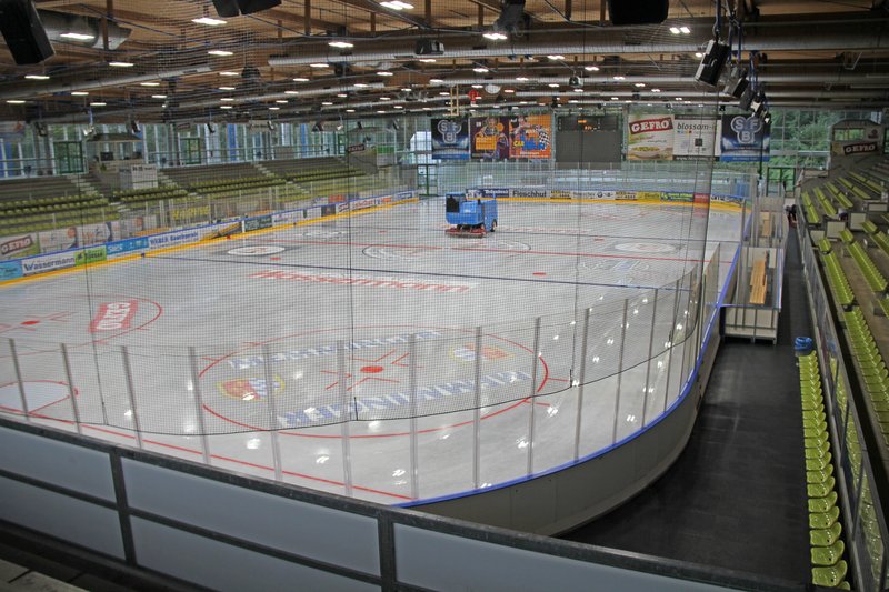 Was wurde konkret gemacht? Nachdem die letzte Eishockeymannschaft um 22:15 Uhr vom Eis war, konnte die Aktion starten. „Das Eis wurde abgehobelt bis auf das Niveau der alten Spiellinien. Das machen wir mit der Eismaschine“, erklärte Jogi Hochsteiner, Betriebsleiter und Eismeister der Eissporthalle. Von Hand wurden auf den alten Linien farbige Fleecebänder eingelegt und das Band mit Hilfe von Kübelspritzen mit Wasser besprüht. „Das Band muss sich mit Wasser vollsaugen und einfrieren, bevor wir dann mit der Maschine darüberfahren können“, erläuterte Hochsteiner. Die Eismaschine versprüht bei jeder Fahrt 1600 Liter heißes Wasser. „Pro Fahrt können wir das Eis etwa einen Millimeter aufbauen. Man braucht dazu heißes Wasser, weil es 20 Prozent weniger Sauerstoff enthält. So bleibt es durchsichtig und verbindet sich besser mit dem Eis“, erklärt Hochsteiner die Technik. Nach jeder Fahrt wird 30 bis 45 Minuten gewartet, bis die Schicht angefroren ist. „Wir nehmen an verschiedenen Stellen Eisproben und prüfen so die Eisdicke. Zum Schluss wird das Eis ganz eben gehobelt.“ Eine 1,5 cm dicke Eisschicht wurde über Nacht aufgebaut. Insgesamt sind es 4,5 cm Eisdicke vom Betonboden bis zur Oberfläche.