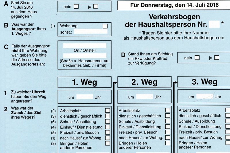 „Wir machen diese umfassende Befragung als Grundlage für zukünftige Entscheidungen, wenn eine Straße verkehrsberuhigt werden soll, eine Baustelle eingerichtet wird oder wenn irgendetwas an einer Straße verändert werden muss“, erklärt Mathias Rothdach vom Stadtplanungsamt. „Mit den erhobenen Daten können wir das Verkehrsverhalten der Leute vorausberechnen.“ Per Zufallsprinzip wurden 10.000 Haushalte im gesamten Stadtgebiet inklusive der Ortsteile ausgewählt, erläutert Rothdach das Verfahren. Die Teilnahme sei freiwillig, die Auswertung erfolge anonym und der Rückversand an das Stadtplanungsamt sei für die Bürger kostenlos.