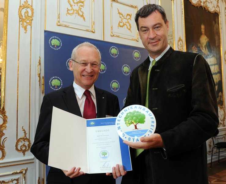 Der Oberbürgermeister Dr. Ivo Holzinger nahm für die Stadt Memmingen das Logo "Gentechnikanbaufreie Kommune" in Empfang. Diese Auszeichnung wurde am 30.06.2011 in Augsburg bei der Regierung von Schwaben von Dr. Markus Söder, Umweltminister u.a. auch an die Stadt Memmingen verliehen. Anlass dieser Verleihung des Logos ist die Entscheidung des Stadtrates von Memmingen auf den kommunalen als auch stiftungseigenen Flächen keine gentechnisch veränderten Pflanzen anbauen zu lassen. Mit diesem Beschluss setzte der Memminger Stadtrat ein Signal gegen Grüne Gentechnik. Rund 150 bayerische Gemeinden, Städte und Landkreise haben sich bewusst zu einer Landwirtschaft ohne gentechnisch veränderte Pflanzen auf ihren kommunalen Flächen bekannt. Künftig können die ausgezeichneten Kommunen unter einem einheitlichen Logo auftreten, um als gemeinsame Initiative verstärkt in der Öffentlichkeit wahrgenommen zu werden.