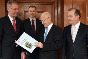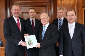Der LBS-Vorstandsvorsitzende in Bayern, Dr. Franz Wirnhier, war persönlich von München nach Memmingen gereist, um die gute Zusammenarbeit mit der Stadt Memmingen zu betonen und dem Oberbürgermeister Dr. Ivo Holzinger im Rathaus die Bausparurkunde zu übergeben.