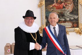Mit einem Festakt im Kreuzherrnsaal bekräftigten Oberbürgermeister Manfred Schilder und Bürgermeister Christian Laprébende die seit über 30 Jahren bestehende Städtepartnerschaft zwischen Memmingen und Auch. „Die Freundschaft und gute Zusammenarbeit unserer beiden Völker ist Grundlage für den Frieden, die freiheitliche Wertegemeinschaft und den Wohlstand in Europa. Wir müssen sie deshalb mit unserer Partnerschaft unterstützen, pflegen und ausbauen; denn Städtepartnerschaften sind die größte Friedensbewegung unserer Zeit“, betonte Oberbürgermeister Manfred Schilder. Gemeinsam mit Bürgermeister Laprébende aus Auch unterzeichnete er Urkunden zur Bekräftigung der Städtepartnerschaft. Eine Abordnung der Musketiere, die mit Auch in enger Verbindung stehen, begrüßte die Ehrengäste vor dem Kreuzherrnkloster.