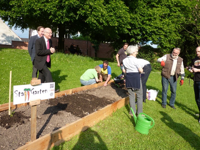 Bereits im März hatten interessierte Bürger gemeinsam mit Memmingens Oberbürgermeister Dr. Ivo Holzinger auf einer Streuobstwiese an der Hohen Wacht junge Apfel- und Birnbäume in die Erde gesetzt. Jetzt wurde mit dreckverschmierten Händen am Grünhang beim Warenhaus Karstadt ein öffentliches Gemüse- und Kräuterbeet angelegt. Dazu trafen sich die Mitglieder der Aktionsgruppe „Stattgarten“ mit Rathauschef Holzinger und setzten ihr selbst mitgebrachtes Gemüse ein.