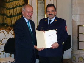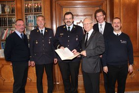 Der Bayerische Staatsminister des Innern, Joachim Herrmann, hat den Memminger Stadtbrandinspektor Wolfgang Bauer mit dem Steckkreuz, der höchsten Form des Feuerwehr-Ehrenzeichens, ausgezeichnet. Die Auszeichnung erhielt Bauer im festlichen Augsburger Rokokosaal der Regierung von Schwaben aus der Hand des Regierungsvizepräsidenten Josef Gediga. Oberbürgermeister Dr. Ivo Holzinger gratulierte dem Geehrten nun bei einem kleinen Empfang in seinem Amtszimmer.