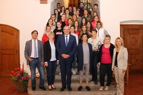 Insgesamt 26 Tänzerinnen und Tänzer im Alter von 15 bis 32 Jahren aus Auch, Frankreich, wurden von Oberbürgermeister Manfred Schilder im Rathaus empfangen. Anlässlich der Veranstaltung Deutsch-französische Tanzmomente kamen die Jugendlichen der Ecole de danse Pascale Pellier nach Memmingen.