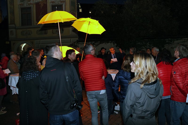 Die Erstellung eines sogenannten Lichtmasterplans für die Memminger Altstadt ist seit Monaten im Gange. Mit temporären Lichtinstallationen sollte nun beim Memminger Altstadt Leuchten ein mögliches Bild der nächtlichen Stadtsilhouette aufgezeigt werden. Oberbürgermeister Manfred Schilder dankte den Teams von licht.raum.stadt planung aus Wuppertal und des Stadtplanungsamts sowie der LEW für die insgesamt neun Stationen, die den Memmingerinnen und Memmingern einen ersten Eindruck für neue Beleuchtungsmöglichkeiten vermitteln sollten.