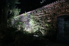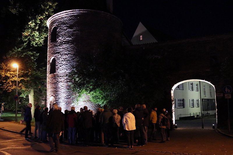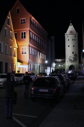 Zweite Station war die Ulmer Straße. Hier war eine Ecke des Grimmelhauses und das Ulmer Tor selber beleuchtet, sodass mehr Struktur und Orientierungsmöglichkeit in die Straße gebracht wurde. Weiter ging es zum Bettelturm, der ebenso wie der Torbogen in der Stadtmauer mit einer Lichtinstallation in Szene gesetzt war. Von hier wurde auch die Stadtmauer Am Luginsland und der Einlass durch Lichter erhellt. Den Abschluss des Rundgangs bildeten die Beleuchtungsmöglichkeiten an der Stadtmauer im Zollergraben und des Stadtbaches beim Mewo Haus.