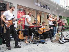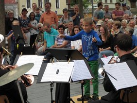 Um die Brassband A7 scharte sich auf dem Schrannenplatz das Publikum und freute sich über das Angebot der Bläser, einfach mal selbst den Taktstock in die Hand zu nehmen. Diese Gelegenheit ließen sich große und kleine Zuschauer nicht entgehen, stiegen auf das Dirigentenpodest und gaben den Takt vor. Dass die Band zwischendurch einfach machte, was sie wollte, sorgte bei den Zuhörern für große Heiterkeit.