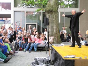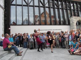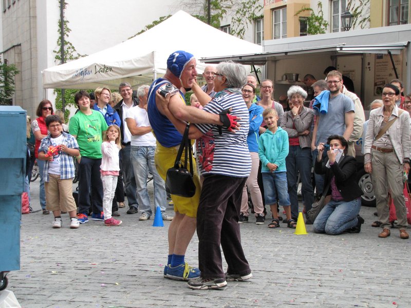 Vom Ensemble Kroft zeigten die aufgetakelten Diven (Sarah Hellein und Hanna Linde) auf dem Theaterplatz, dass sie bereit sind, für ein bisschen Ruhm alles zu geben. Sie sangen und steppten sich die Seele aus dem Leib, während ein Herr aus dem Publikum die (Puppen-)Kinder hütete. Auf dem Marktplatz stellte Ralf Reichard, ebenfalls vom Ensemble Kroft, das Marktleben auf den Kopf und kletterte aus einem riesigen Werkzeugkasten, um "Zack, Zack" neue sportliche Rekorde aufzustellen.