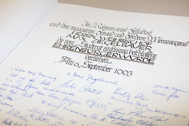 Die Stadt Memmingen trauert um ihren Ehrenbürger Weihbischof em. Max Ziegelbauer, der am Montag 21. November 2016, verstorben ist. In einer ersten Reaktion sagte Oberbürgermeister Markus Kennerknecht: "Die Stadt verliert mit ihrem Ehrenbürger Weihbischof Max Ziegelbauer einen Fürsprecher für Memmingen, der sich jahrzehntelang für seine Heimatstadt eingesetzt hat. Auch in seinen fast 50 Jahren in Augsburg, in denen er in der Diözesanleitung wirkte, dachte er für seine Heimatstadt und konnte vieles zugunsten Memmingens bewegen.“ In den 50er und 60er Jahren baute Max Ziegelbauer als Stadtpfarrer die neu gegründete Pfarrei Mariä Himmelfahrt auf. 1993 wurde ihm die Ehrenbürgerwürde verliehen, „dem engagierten Freund und Förderer Memmingens“, wie es im Goldenen Buch der Stadt heißt. „Persönlich habe ich ihn leider nur kurz kennenlernen dürfen, war aber bei unseren Begegnungen beeindruckt von seiner großen Wachheit im Geist und seiner umfassenden Bildung", betonte Oberbürgermeister Markus Kennerknecht.