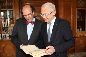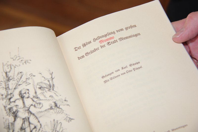 „Der schöne Heldengesang vom großen Mammo, dem Gründer der Stadt Memmingen“ lautet der Titel eines Buches, das Paul Iacob, Bürgermeister von Füssen, nun im Rathaus an Oberbürgermeister Dr. Ivo Holzinger überreichte. Das 40-seitige Büchlein kam 1927 heraus und ist von Wilhelm Iacob, dem Großvater von Paul Iacob, geschrieben worden. Wilhelm Iacob war Memminger Bürger und hat als Lehrer in der Maustadt gearbeitet. Oberbürgermeister Holzinger dankte für die schöne Ergänzung der bislang noch wenigen Publikationen, die die frühe Stadtgeschichte thematisieren.