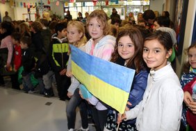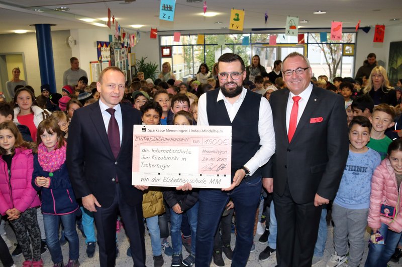 Rund 400 Grundschulkinder drängten sich in der Pausenhalle der Elsbethenschule und sangen lautstark fröhliche Lieder für eine Delegation aus Memmingens ukrainischer Partnerstadt Tschernihiw, die von Oberbürgermeister Vladyslav Atroshenko angeführt wurde. Die Kinder hatten mit dem Verkauf von selbstgemachten kleinen Kunstwerken eine ansehnliche Summe verdient, die vom Lehrerkollegium der Elsbethenschule verdoppelt wurde, und so konnte stellvertretender Schulleiter David Ott 1.500 Euro für die Partnerschule Yuri Kotsybynskyi in Tschernihiw überreichen.