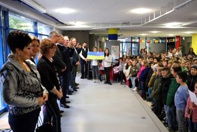 Oberbürgermeister Manfred Schilder dankte den Kindern und dem Kollegium für ihren tollen Einsatz zugunsten ukrainischer Schulkinder. Tschernihiws Oberbürgermeister Atroshenko sprach eine Einladung nach Tschernihiw aus, um Altersgenossen an der Partnerschule kennenzulernen. Die Delegation aus der Ukraine zeigte sich begeistert von dem fröhlichen Auftritt der Kinder und hielt mit ihren Handys die bunten Eindrücke fest.