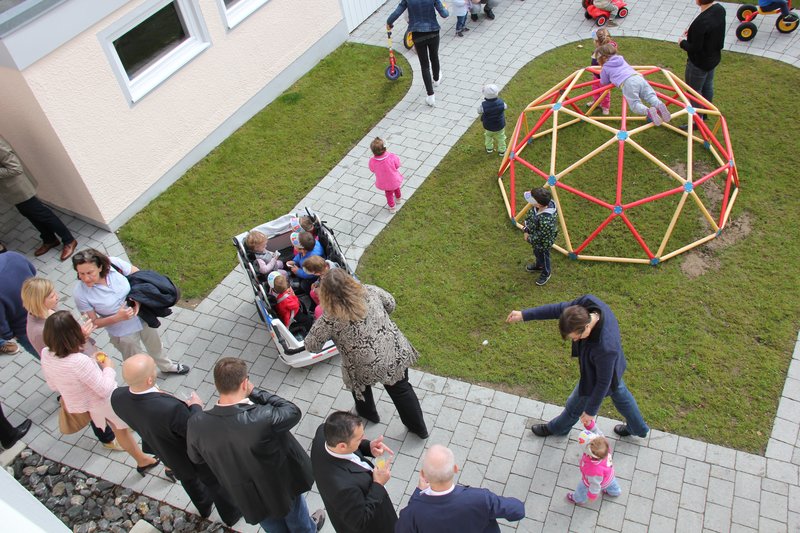 23 quirlige Mädchen und Buben unter drei Jahren waren die Stars einer Feier in der Kinderkrippe Stebenhaberstraße zum Abschluss einer Teilsanierung. Die kleinen Memmingerinnen und Memminger empfingen Oberbürgermeister Dr. Ivo Holzinger und ihre Festgäste mit einem fröhlichen Lied im Vorgarten der Kinderkrippe, der bei der Sanierung mit einem neuen Fahrweg für Kinderfahrzeuge ausgestattet worden ist. Die kleine Louisa nahm strahlend ein Geschenk des Oberbürgermeisters entgegen, ein leuchtend rotes Bobbycar für den Fuhrpark der Krippe.