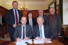 Die baden-württembergische Landesflagge in den Farben Schwarz und Gold wehte am Rathaus zu Ehren der Besucher aus den württembergischen Nachbargemeinden: Zu einer Vertragsunterzeichnung waren die Bürgermeister Jochen Ackermann (Erolzheim), Rainer Langenbacher (Kirchdorf) und Walther Puza (Berkheim) ins Memminger Rathaus gekommen und besiegelten mit ihrer Unterschrift den Anschluss der Illertalgemeinden an das Memminger Gruppenklärwerk in Heimertingen.