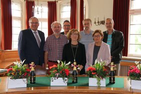 Manfred Schilder überreichte den Beschäftigten die Urkunden sowie Blumen und Sekt. „Ich weiß es ist in keinem Beruf immer leicht, ob das in der Altenpflege oder im Wald oder in einer Küche ist. Deshalb freut es mich umso mehr, dass Sie sich schon so lange für diese Stadt engagieren“, fasste Schilder zusammen.