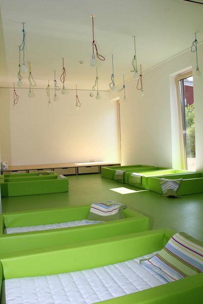 Architekt Jan-Thilo Joachim bezeichnete es als eine „schöne Aufgabe“ eine Kinderkrippe planen und entwerfen zu dürfen. „Wir haben das Gebäude so gestaltet, dass es sich in den parkähnlichen Garten unter den Bäumen einfügt und ein großzügiger Ausblick ins Grüne die Innen- und Außenräume zusammenführt“, erläuterte Joachim das planerische Konzept.