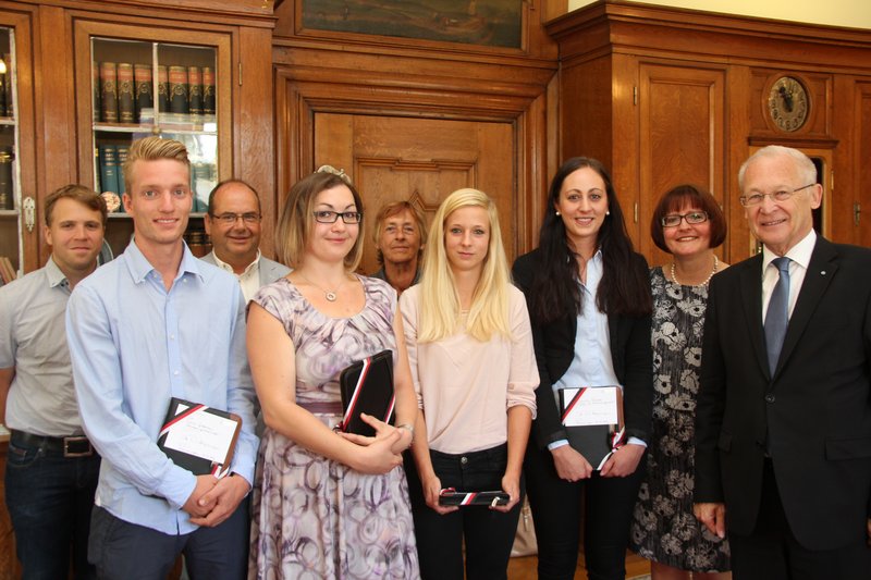 Oberbürgermeister Dr. Ivo Holzinger hob in seiner Laudatio die besonderen Leistungen der jungen Nachwuchskräfte der Stadt Memmingen hervor. Als kleine Anerkennung überreichte das Stadtoberhaupt den ehemaligen Auszubildenden eine Schreibmappe mit dem Signet der Stadt. Für die berufliche Zukunft wünschte der Rathauschef allen weiterhin viel Erfolg und alles Gute.