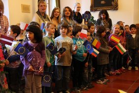 Über 50 Kindergartenkinder sangen im Rahmen der Festveranstaltung zur Verleihung des Ehrendiploms im Rathaus ein „internationales Begrüßungslied“, schwenkten bunte Fähnchen mit den Flaggen vieler europäischer Länder und hatten dabei sichtlich ihre Freude. Ihre Freude hatte auch die Leiterin des Wartburgkindergartens, Barbara Schelle. „Sich in mehreren Sprachen zu verständigen, ist eine elementare Erfahrung von Kindern im Wartburgkindergarten“, sagt Barbara Schelle.