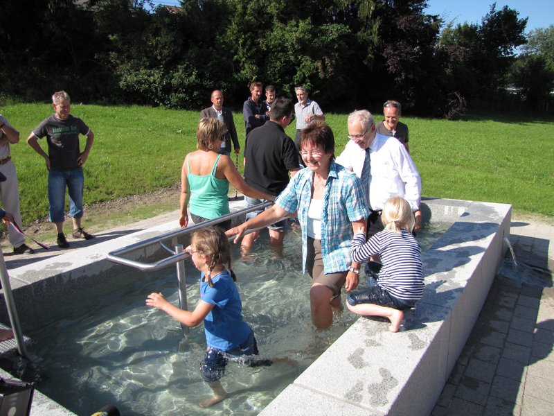 „Wo sind denn die Fische?“, fragte Oberbürgermeister Dr. Ivo Holzinger den kleinen Jakob als er in das Becken schaute. „Wois net“, war die Antwort von Jakob, der zusammen mit anderen Kindern vom Kindergarten Dickenreishausen und den Vertretern des Bürgerausschusses sowie den Ehrengästen zur neuen Wassertretanlage gekommen war.