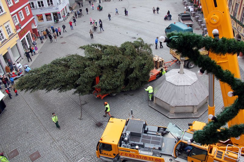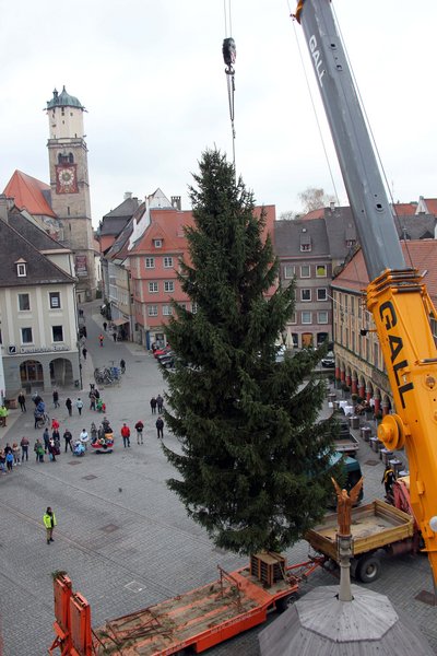 Beide Bäume stammen aus Amendingen: Am Mittwochmorgen stellten Mitarbeiter der Stadtgärtnerei die Christbäume auf dem Marktplatz und auf dem Schrannenplatz auf. Die Fichte am Rathaus ist heuer 13 Meter hoch. Der Baum auf dem Schrannenplatz 10 Meter.
