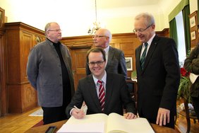 Hoher Besuch aus der Landespolitik: Der Fraktionsvorsitzende der BayernSPD im Bayerischen Landtag, Markus Rinderspacher MdL, besuchte jetzt Memmingen. Mit den Worten „Vielen Dank für den freundlichen Empfang in der Stadt der Tore und Türme, Giebel und Fassaden. Mögen sich künftig weiter viele Bürgerinnen und Bürger für das Allgemeinwohl ihrer Stadt einsetzen“trug sich Rinderspacher in das Goldene Buch der Stadt ein, bevor er gemeinsam mit Oberbürgermeister Dr. Ivo Holzinger, MdL a. D. Herbert Müller und Stadtratsfraktionsvorsitzendem Werner Häring bei einem Pressegespräch Positionen der SPD in der Kommunalpolitik verdeutlichte.