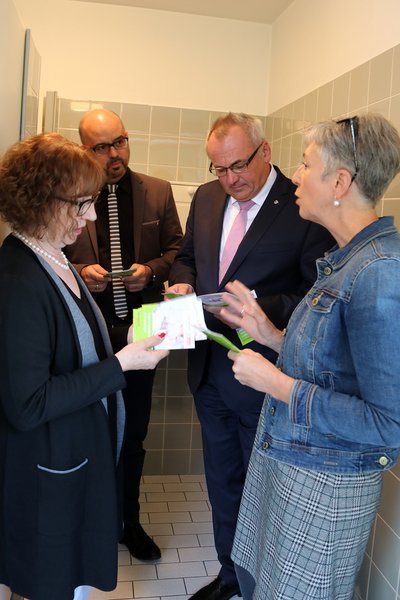 Der Alltag mit Babys ist oft nicht bis ins Detail planbar. Um Familien den Stadtbesuch mit kleinen Kindern zu erleichtern, stellten die Gleichstellungsbeauftragte und Koordinatorin vom „Bündnis für Familien“ Claudia Fuchs und Jugendamtsleiter Jörg Haldenmayr Oberbürgermeister Manfred Schilder und der zweiten Bürgermeisterin Margareta Böckh den neuen Flyer „Wickelmöglichkeiten in Memmingen“ vor.