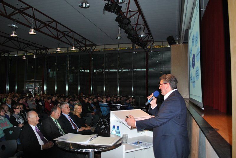 Oberbürgermeister Dr. Ivo Holzinger begrüßte den Vorstandsvorsitzenden der Goldhofer AG Memmingen, Stefan Fuchs und den Niederlassungsleiter der Firma Dachser Memmingen, Thomas Henkel, in der voll besetzten Aula des Vöhlin Gymnasiums. Er dankte den beiden Unternehmensvertretern für ihre Bereitschaft über die Auswirkungen der EU auf Unternehmen und ihre damit verbundenen Erfahrungen zu berichten. Das Stadtoberhaupt unterstrich bei dieser Gelegenheit, die Bedeutung der beiden Wirtschaftsbetriebe für den Standort Memmingen.