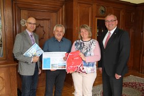Thomas und Renate Proksch aus Lachen-Theinselberg sind die glücklichen Gewinner von zwei Startplätzen für die BR-Radltour. Oberbürgermeister Manfred Schilder überreichte ihnen einen Gutschein und gratulierte sehr herzlich. "Ich werde Sie nach Kräften unterstützen", sagte der Oberbürgermeister mit einem Schmunzeln zu und plante gleich mit den beiden Gewinnern, eine Etappe mitzuradeln.