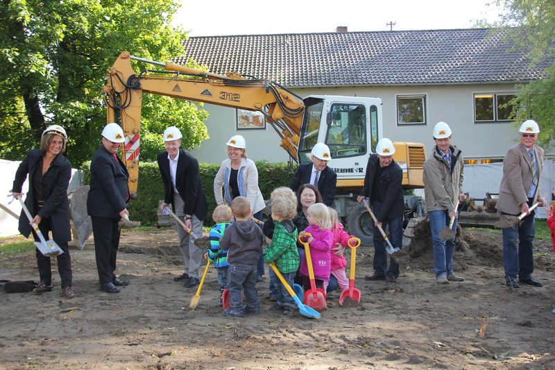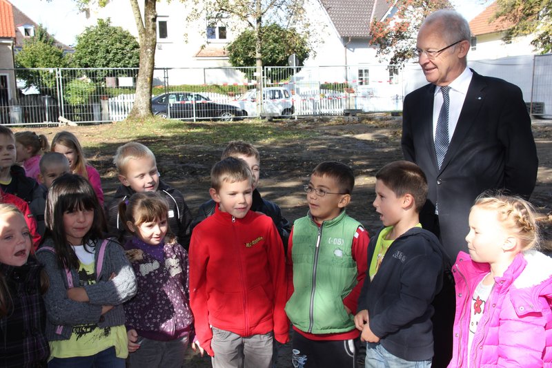 Noch bevor der Oberbürgermeister mit dem bereitstehenden Bagger den ersten „Stich“ tätigte begrüßten die Vorschulkinder mit einem selbstgedichteten Lied bereits die neuen Kinder: „Wie schön dass ihr die Krippe baut ... wir freuen uns über jedes Krippenkind“, tönte es über die Baustelle. Als Belohnung bekamen die Buben und Mädchen eine kleine „Stadttaschenlampe“. Und als dann die Vertreter der Baufirma, der Architekt und die Gäste zusammen mit Dr. Holzinger zum Spaten greifen sind die sechs Krippenkinder nicht mehr zu halten. Fleißig helfen sie mit, schaufeln den Boden weg und sind sichtlich bemüht, den Bau voranzutreiben. Zur Stärkung gab es danach ein Glas Apfelsaftschorle und dann ging es zurück in die Krippe Stebenhaberstraße zum Mittagsschlaf, denn wer arbeitet, soll auch ruhen.