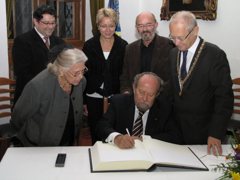 Vor der Gedenkfeier in der Martinskirche besuchte eine kleine Gruppe um den Landesrabbiner im Stadtmuseum die Sonderausstellung über jüdisches Leben in Memmingen. Kulturamtsleiter Dr. Hans-Wolfgang Bayer erläuterte bei der Führung das Modell der Synagoge und zeigte rare Fundstücke wie ein Fragment der Gründungsurkunde und einen Marmorstein aus dem Pult zur Tora-Lesung.