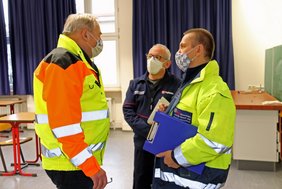 Oberbürgermeister Manfred Schilder im Gespräch mit Bruno Ollech, stv. Bezirksgeschäftsführer der Malteser (Mitte) und Andreas Land, Leiter des Amts für Brand- und Katastrophenschutz.