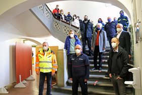 Für einen professionellen Betrieb des Impfzentrums sorgen (1. Reihe v.l.): Oberbürgermeister Manfred Schilder, Bruno Ollech, stv. Bezirksgeschäftsführer des Malteser Hilfsdiensts, Ärztlicher Koordinator für Corona in MM, Dr. Jan Henrik Sperling, (2. Reihe v.l.) Dr. Hardy Götzfried, ärztlicher Leiter des Impfzentrums Memmingen, Dr. Max Kaplan, ärztlicher Koordinator für Corona im LK Unterallgäu, Dr. Heinz Leuchtgens, ärztlicher Leiter des Impfzentrums in Bad Wörishofen, (2. Reihe v.l.) Stadtbrandrat Raphael Niggl und Klaus Liepert, Ortsbeauftragter des Technischen Hilfswerks Memmingen-Unterallgäu sowie zahlreiche Mitarbeiterinnen und Mitarbeiter der Hilfs- und Rettungsdienste (Fotos: Alexandra Wehr/ Pressestelle Stadt Memmingen)
