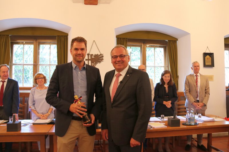 Auf der vergangenen Sitzung des Memminger Stadtrats ehrte Oberbürgermeister Manfred Schilder Stadtrat Michael Hartge für seine zehnjährige Tätigkeit in diesem Gremium. Schilder dankte Hartge für sein Engagement als stellvertretender Fraktionsvorsitzender der ÖDP sowie als Referent für Kinderspielplätze und überreichte eine Flasche Sekt.