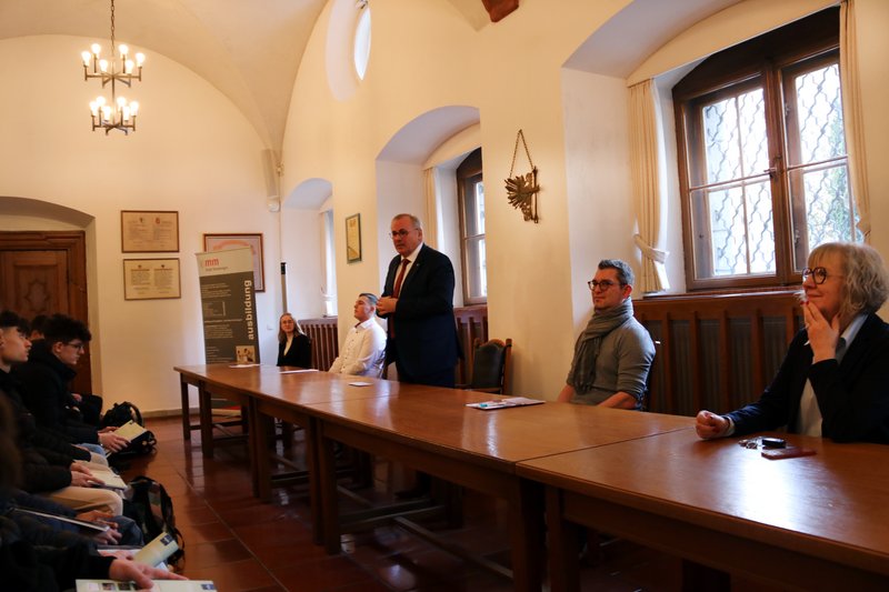 Die Zehntklässler ließen sich zunächst von Jochen Wiest, dem stellvertretenden Leiter des Personalamts, über den Ausbildungsbetrieb Stadt Memmingen und die verschiedenen Ausbildungsberufe informieren. Die beiden Auszubildenden Amelie Karrer und Pascal Anger erzählten von ihrem bisherigen Werdegang bei der Stadt – vom Bewerbungsverfahren bis hin zu den Stationen in den verschiedenen Ämtern gewährten sie den Schülerinnen und Schülern einen Einblick in ihre Ausbildung. Anschließend gaben Schilder und Böckh Auskunft über die Arbeit als Chef der Verwaltung und die politische Arbeit im Stadtrat, dem der Oberbürgermeister vorsitzt.
